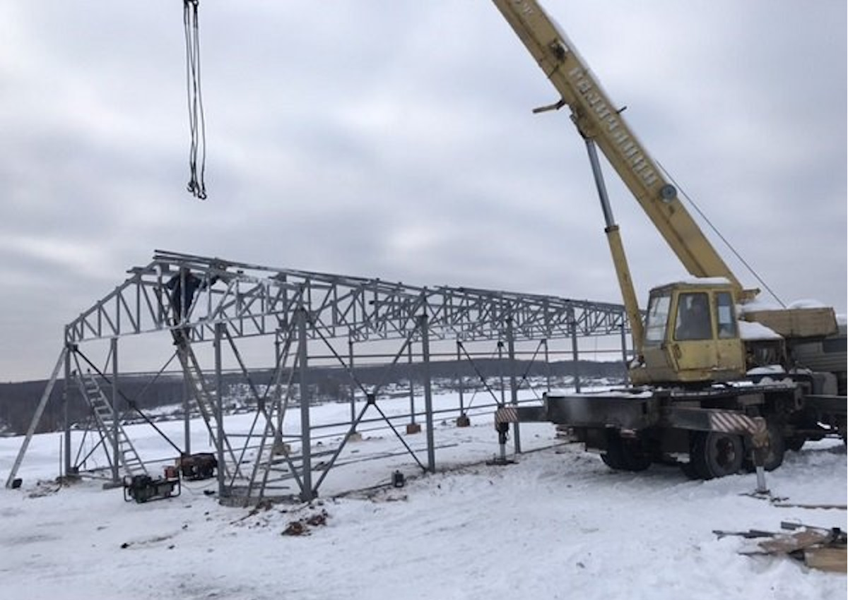 Работы по монтажу прямостенного ангара с двухскатной крышей